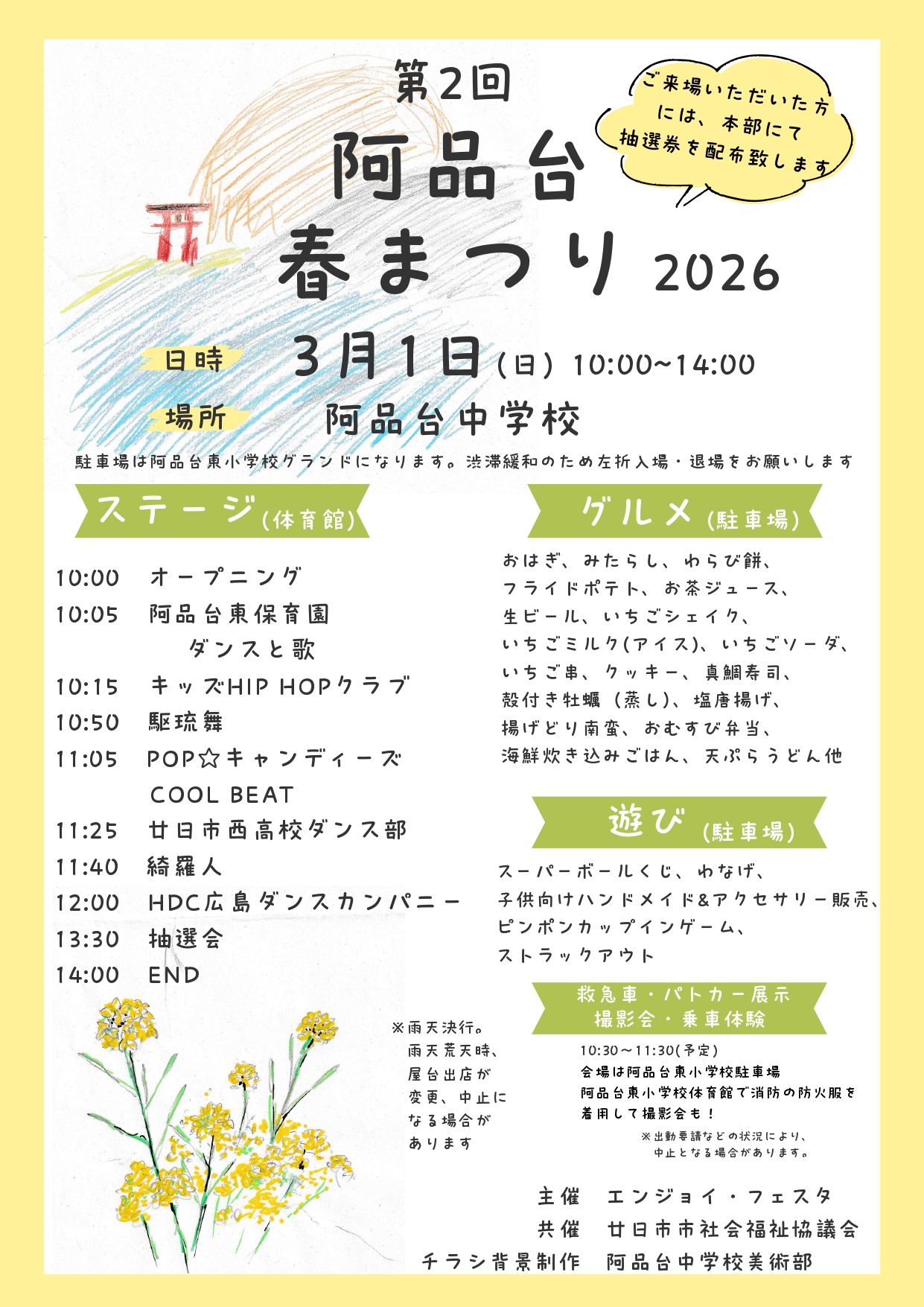 3月1日、阿品台中学校を会場に、阿品台 春まつり2026が開催されます。